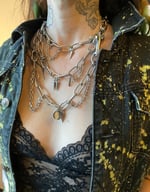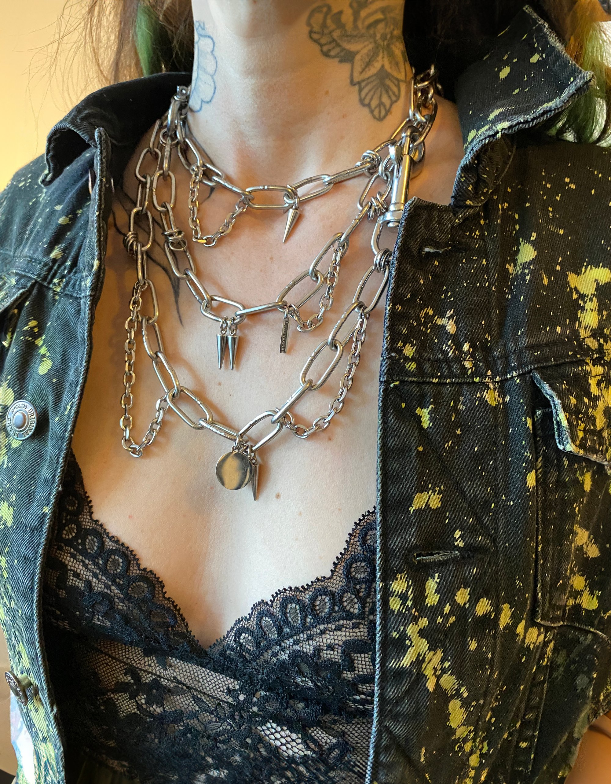 This is a heavy-duty necklace made from stainless steel. It’s fully adjustable to fit any neck size and closes with a shackle and carabiner.
