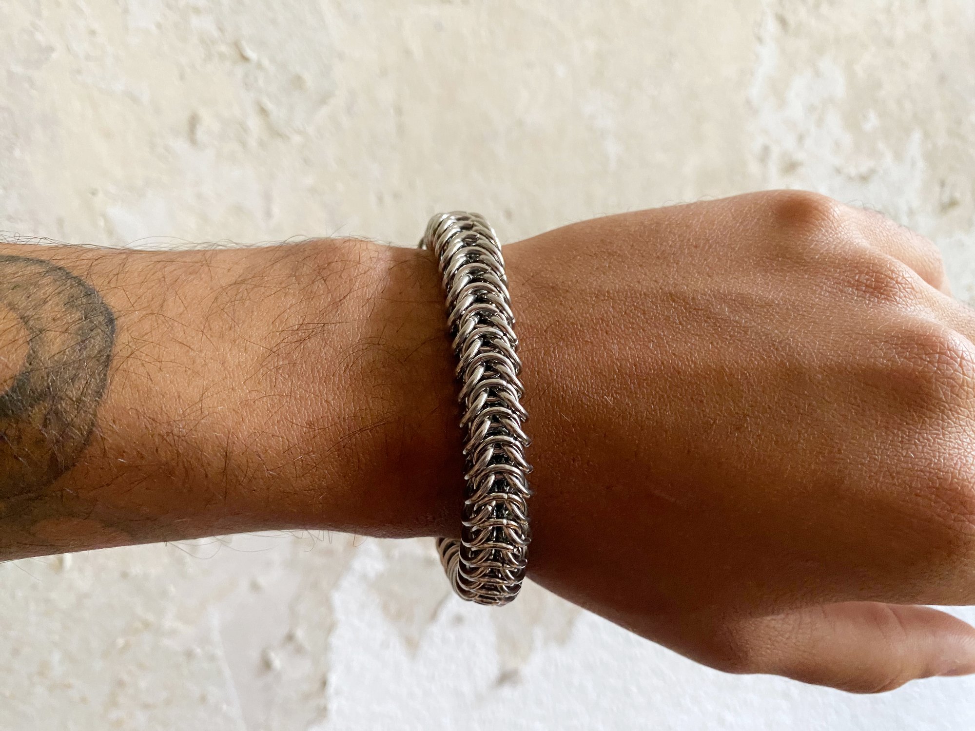 This is a box weave bracelet, crafted from stainless steel. It is made to order and can be adjusted to ensure the perfect fit.